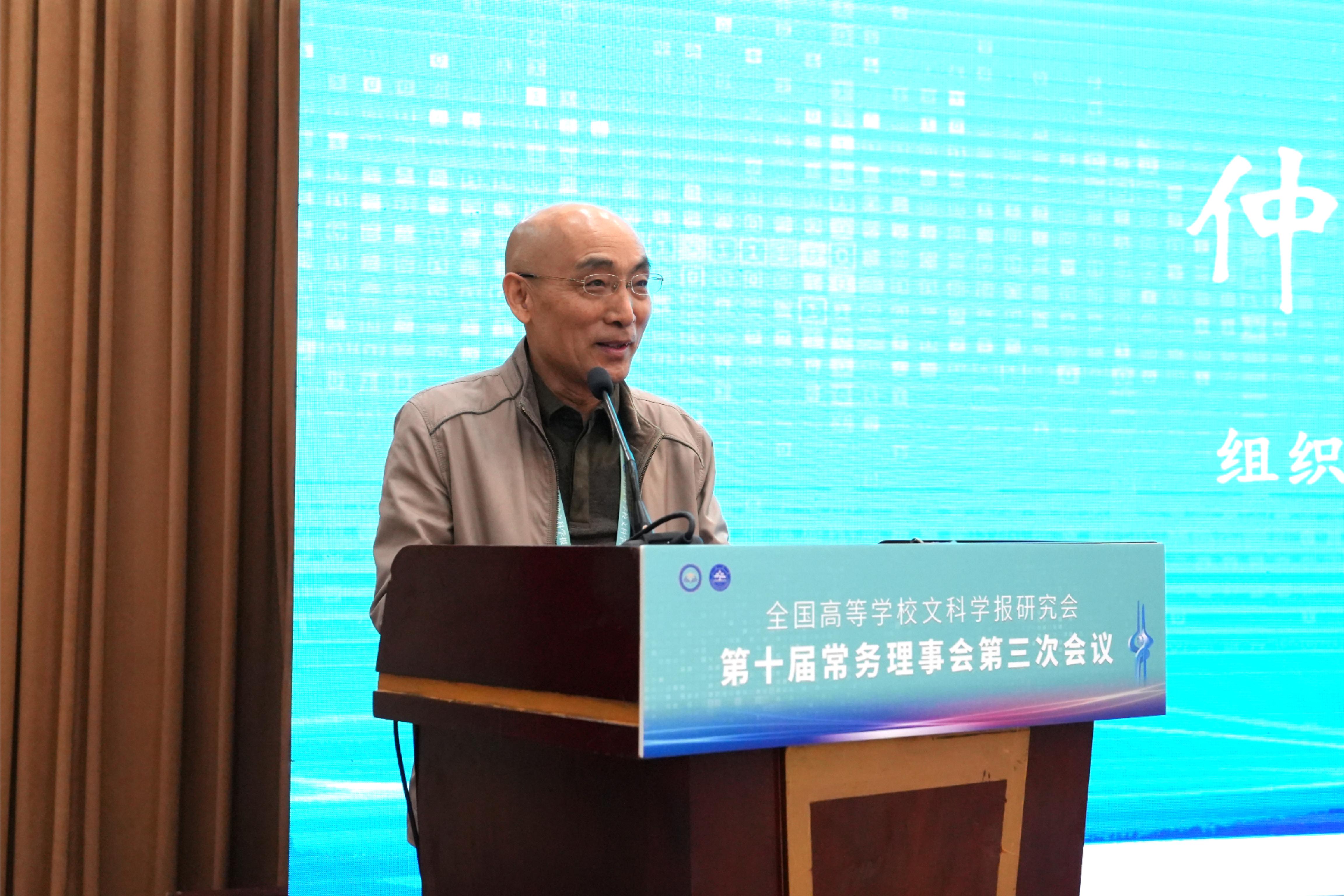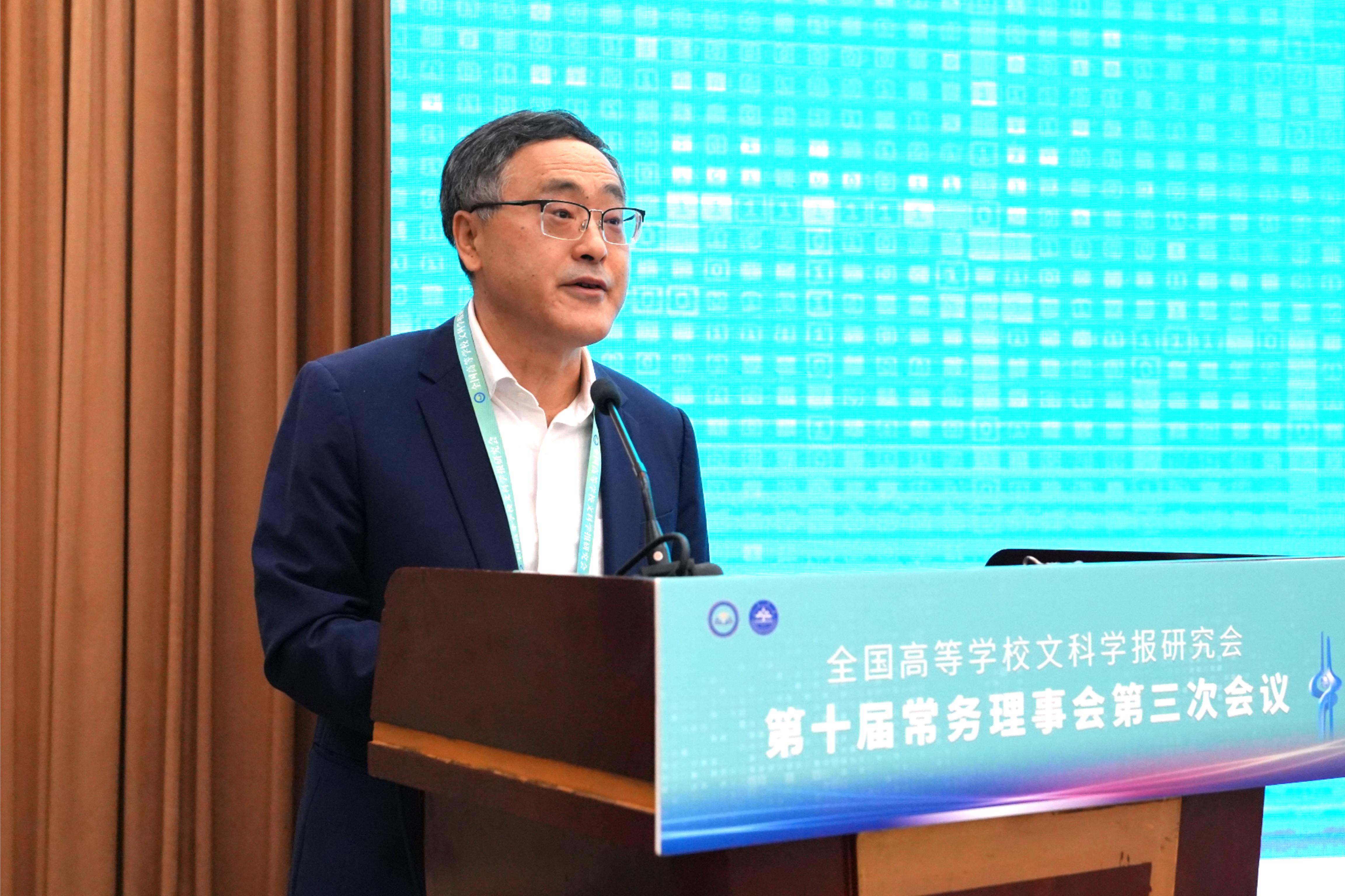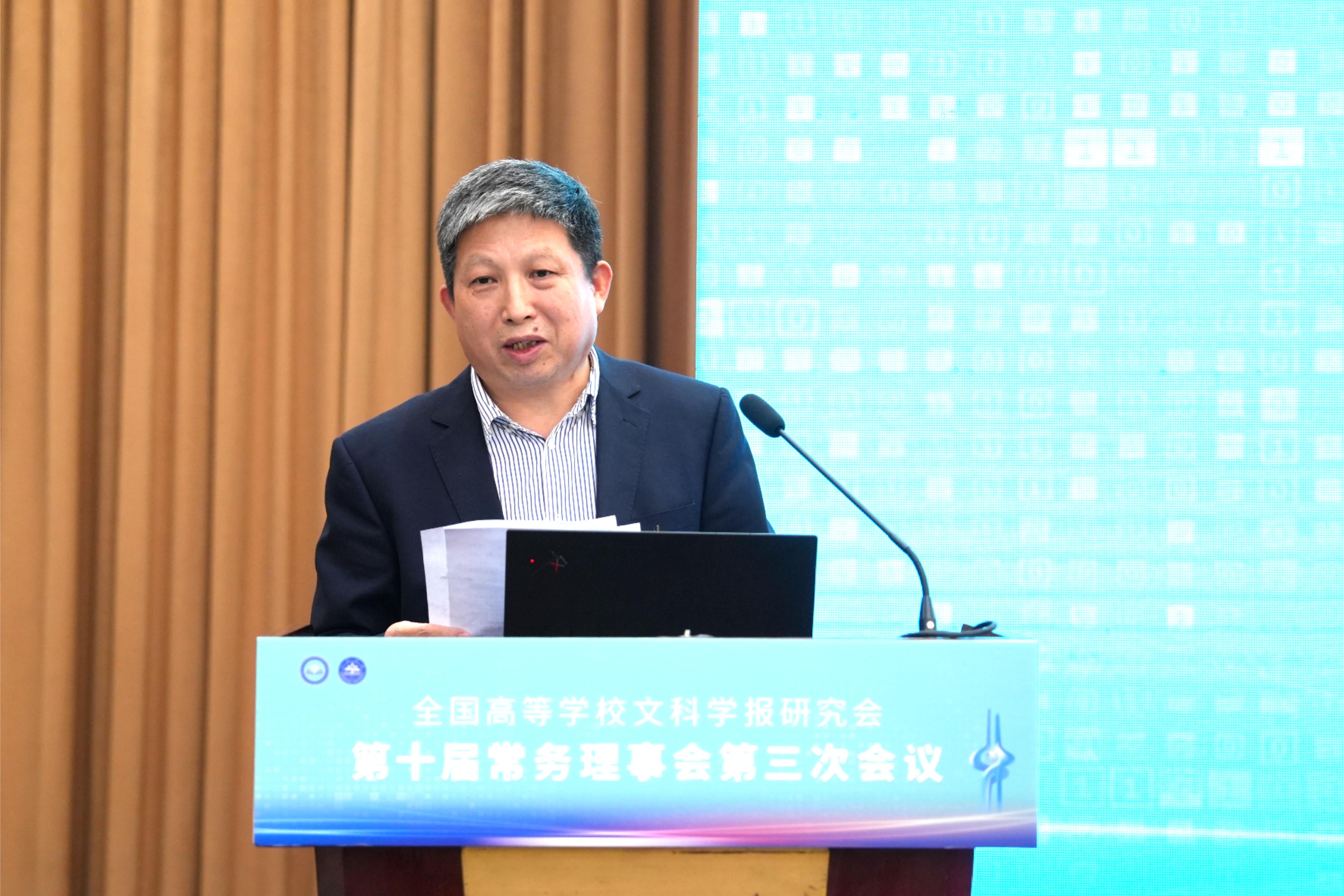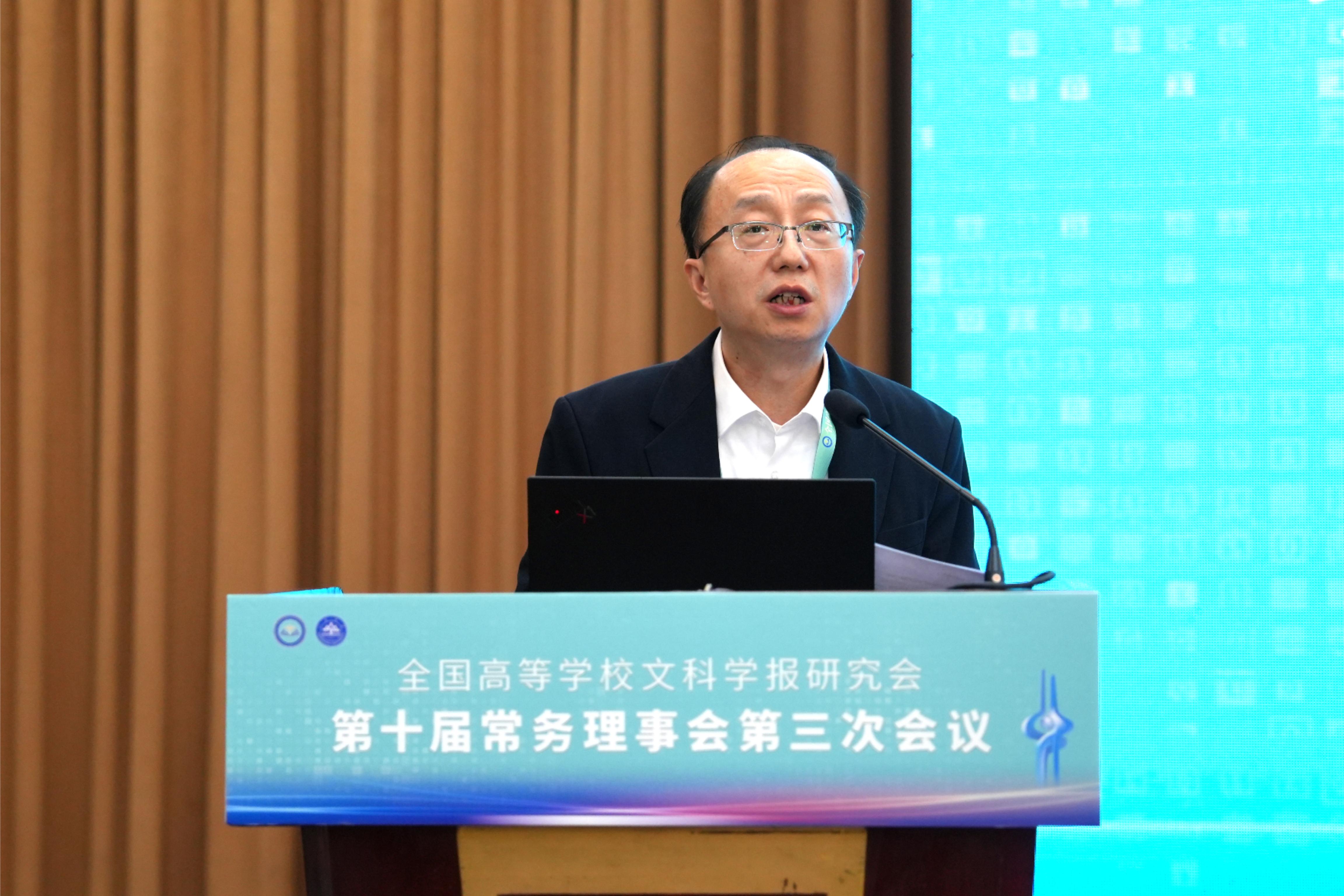 与《文史哲》编辑部对会议的支持,同时也对中宣部及山东省委宣传部领导的莅临表示感谢,指出主管部门的指导对研究会和期刊的发展具有重要帮助。他强调,研究会及各学报应紧密围绕习近平总书记“明体达用,体用贯通”的文化思想,在以下七个方面展开工作:第一,要打造期刊核心竞争力,建构中国特色的期刊体系;第二,要贯彻新的办刊理念,自觉服务于中国特色哲学社会科学、中国自主知识体系的建构;第三,要处理好理论与实践、学术与政治的关系,自觉服务国家发展战略;第四,要处理好学术与评价的关系,建构中国特色的期刊评价体系;第五,要积极应对数字时代人工智能的挑战,探索学术期刊未来的发展趋势;第六,要扶持人才成长,扶持培育青年才俊;第七,要架设各种文明互学互鉴的桥梁,积极推动中华文化走向世界。
