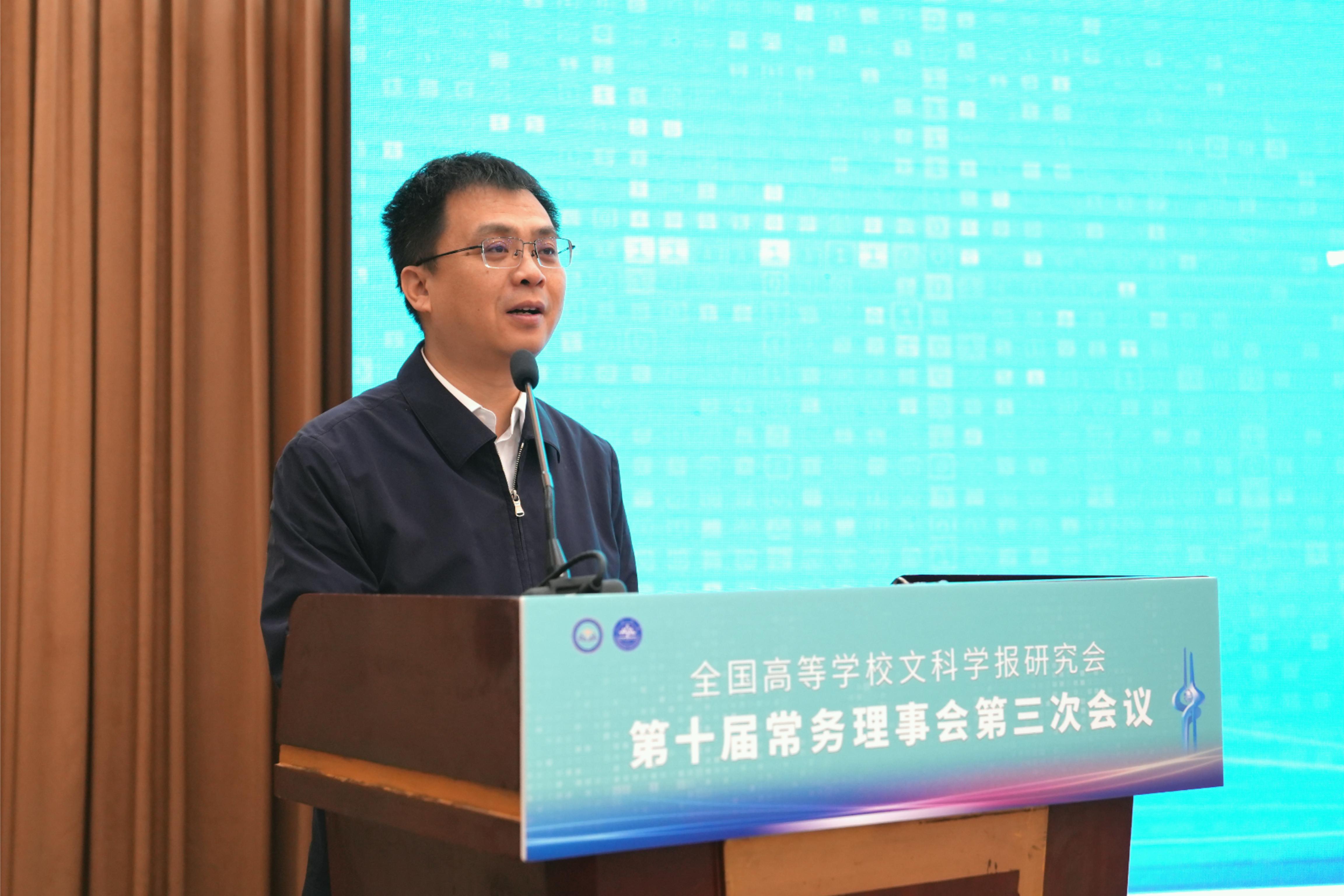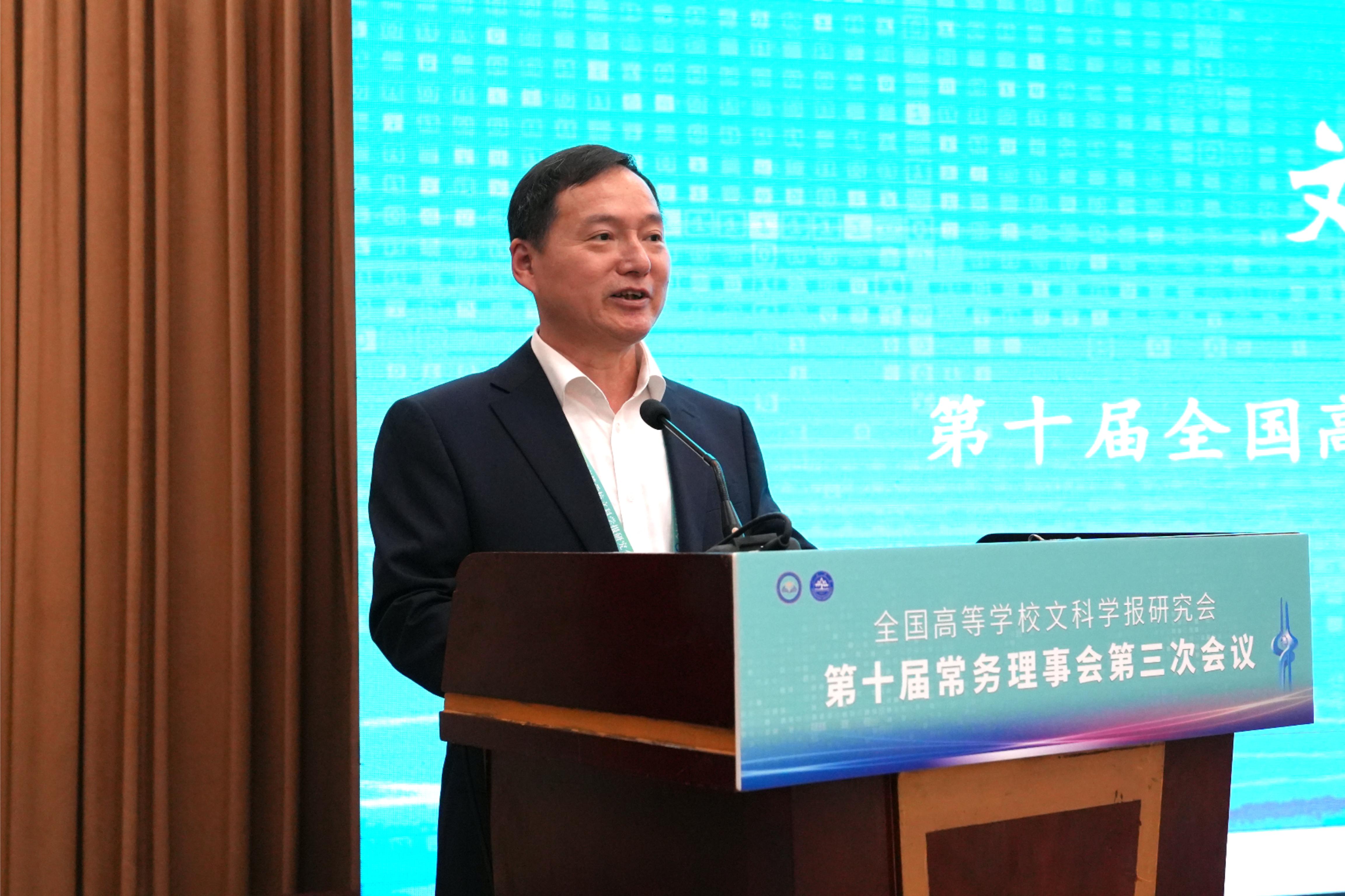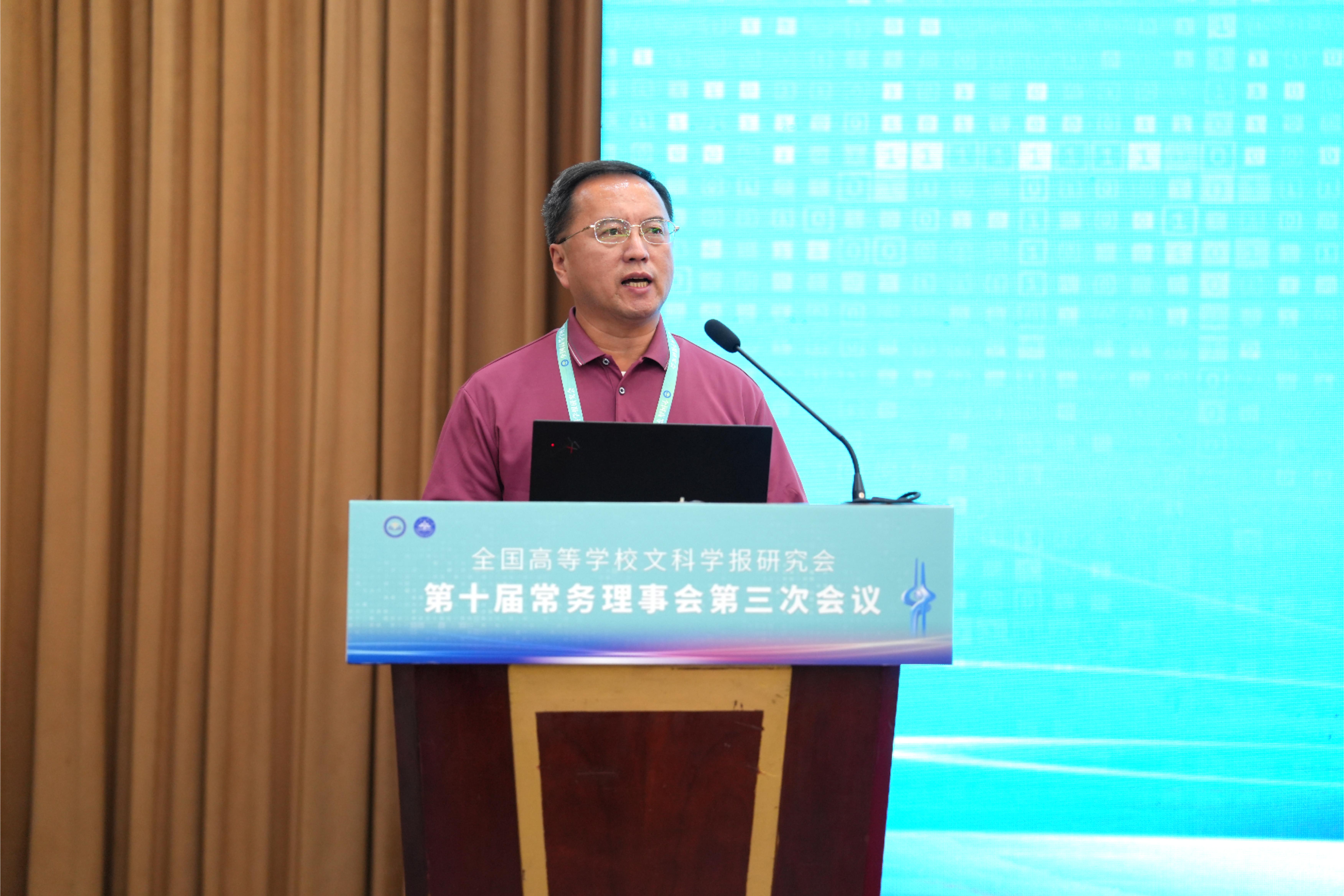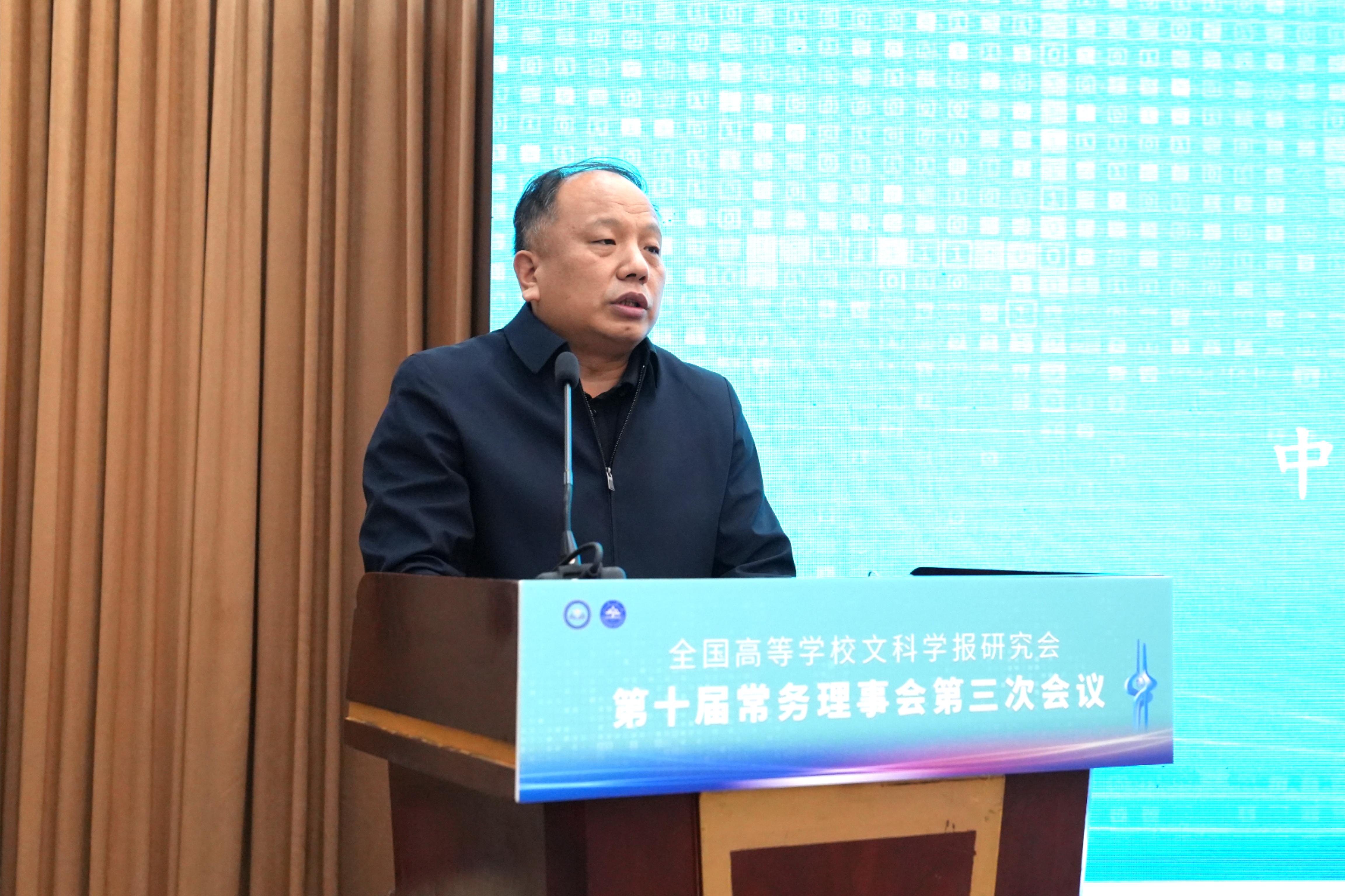 与《文史哲》编辑部对会议的支持,同时也对中宣部及山东省委宣传部领导的莅临表示感谢,指出主管部门的指导对研究会和期刊的发展具有重要帮助。他强调,研究会及各学报应紧密围绕习近平总书记“明体达用,体用贯通”的文化思想,在以下七个方面展开工作:第一,要打造期刊核心竞争力,建构中国特色的期刊体系;第二,要贯彻新的办刊理念,自觉服务于中国特色哲学社会科学、中国自主知识体系的建构;第三,要处理好理论与实践、学术与政治的关系,自觉服务国家发展战略;第四,要处理好学术与评价的关系,建构中国特色的期刊评价体系;第五,要积极应对数字时代人工智能的挑战,探索学术期刊未来的发展趋势;第六,要扶持人才成长,扶持培育青年才俊;第七,要架设各种文明互学互鉴的桥梁,积极推动中华文化走向世界。