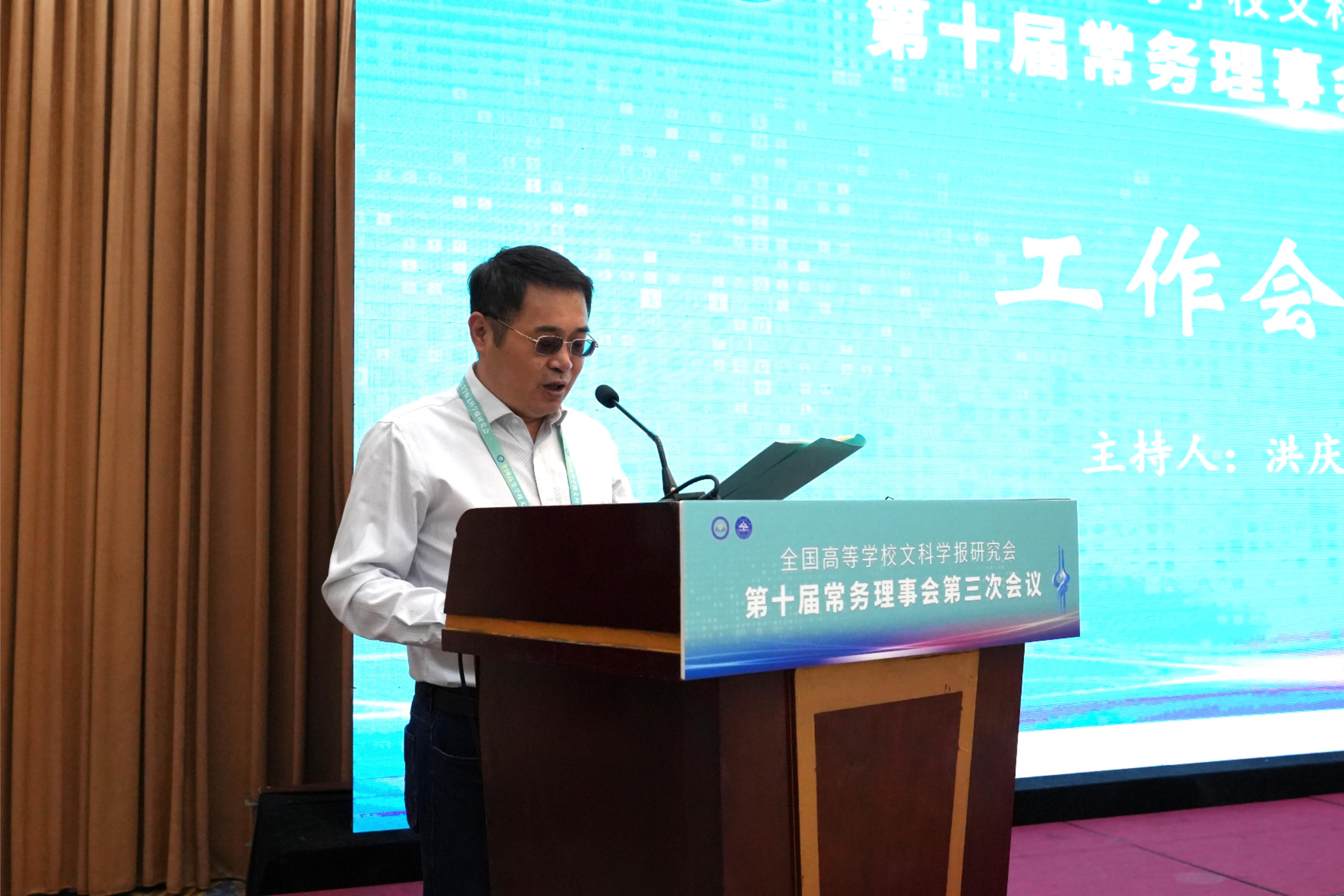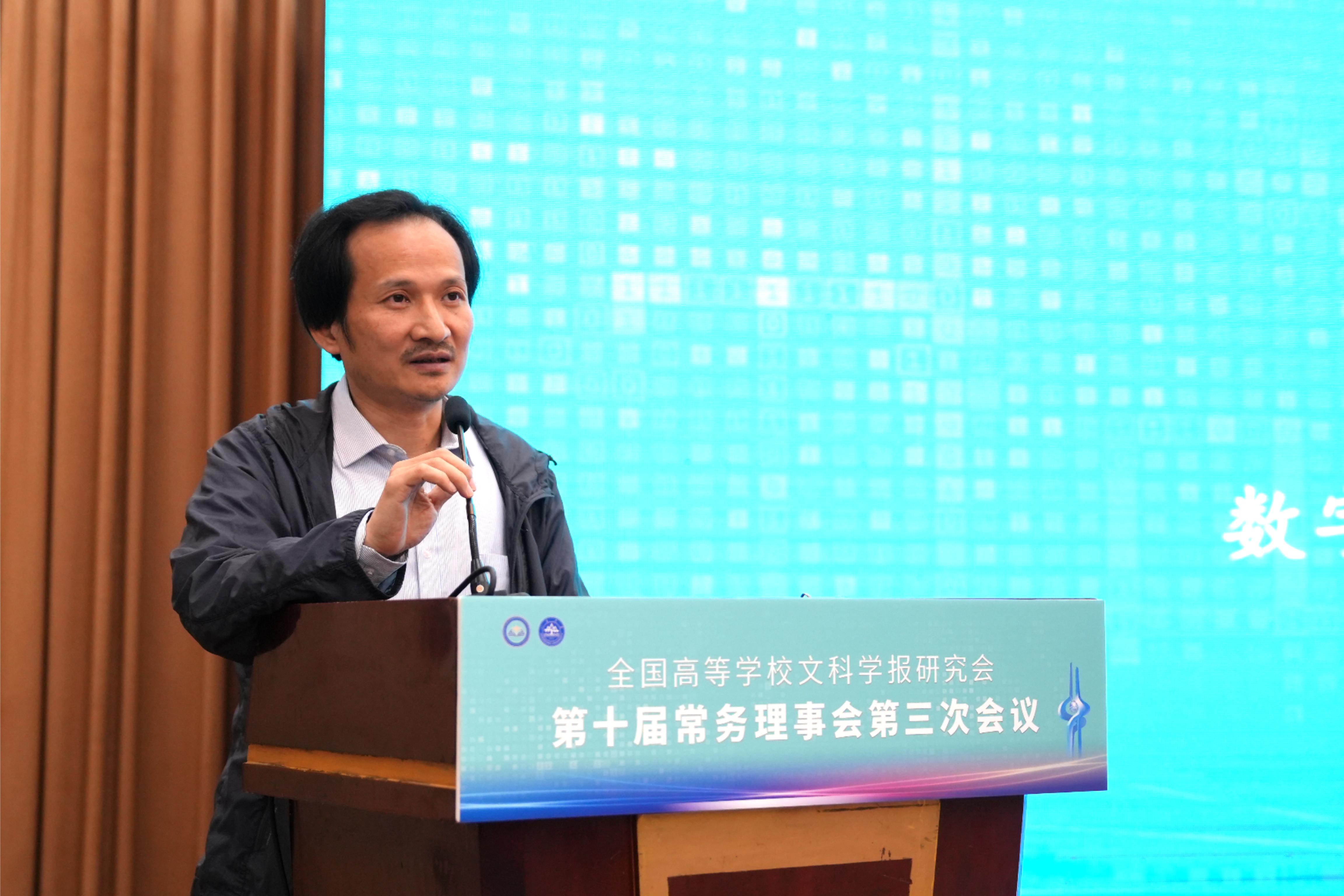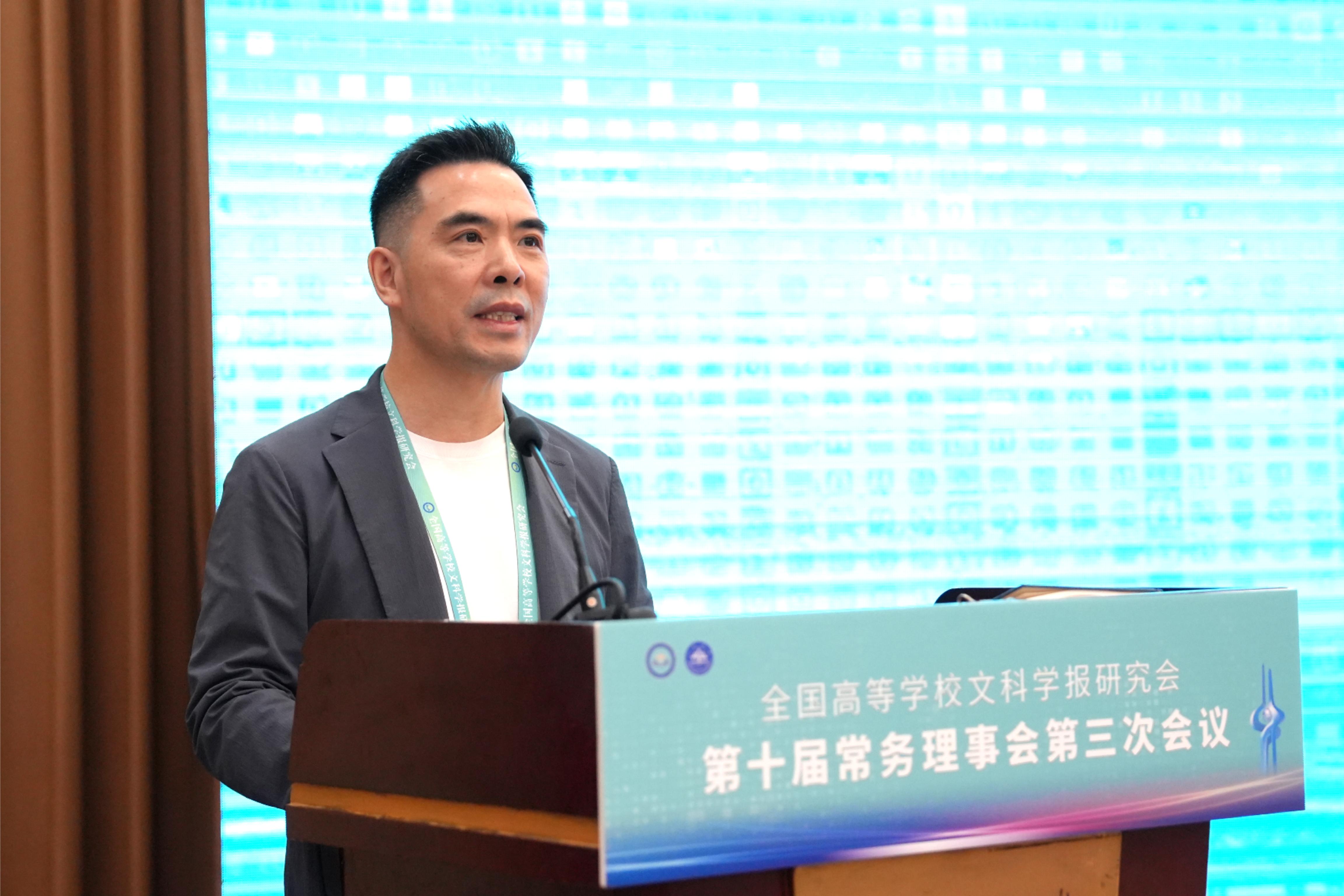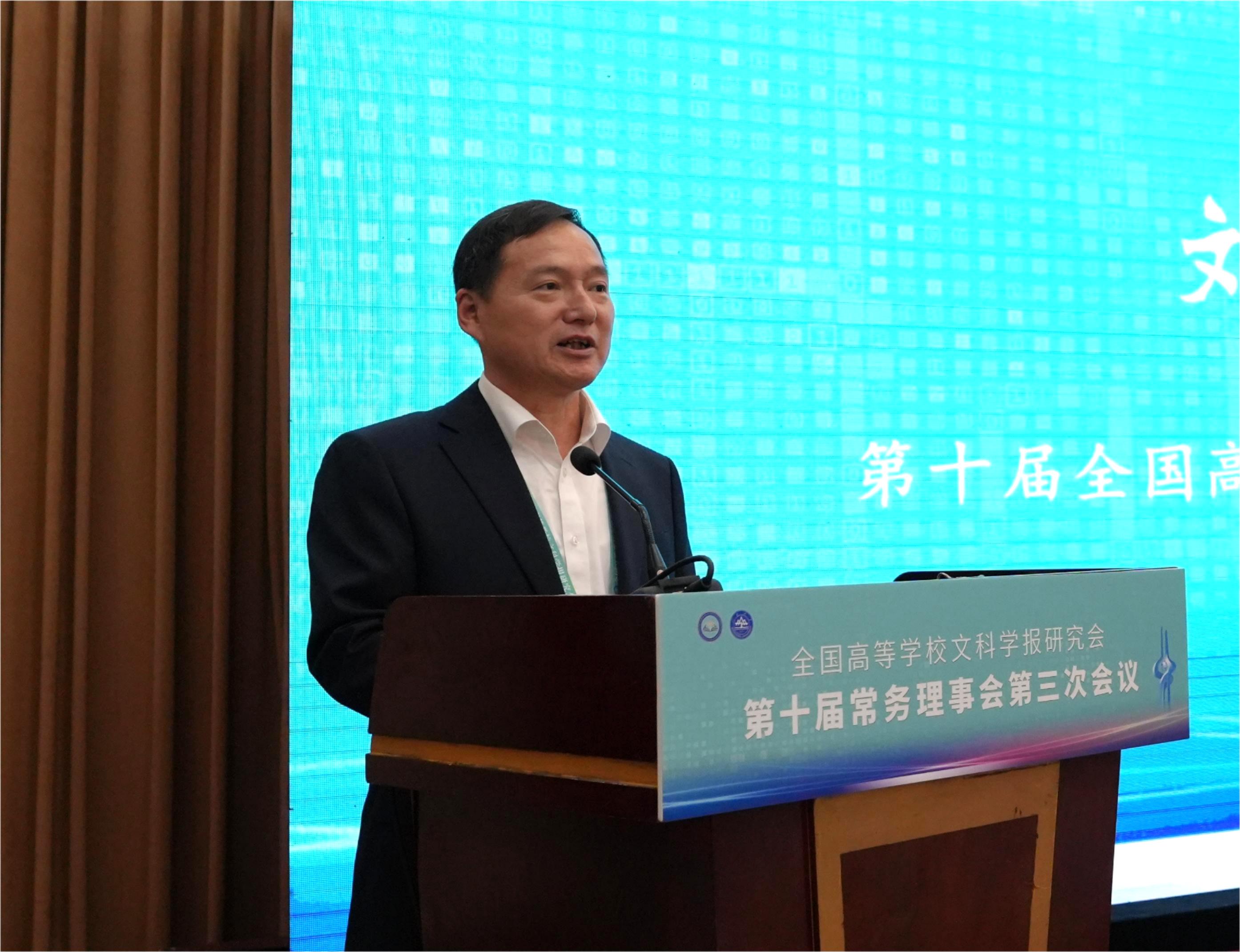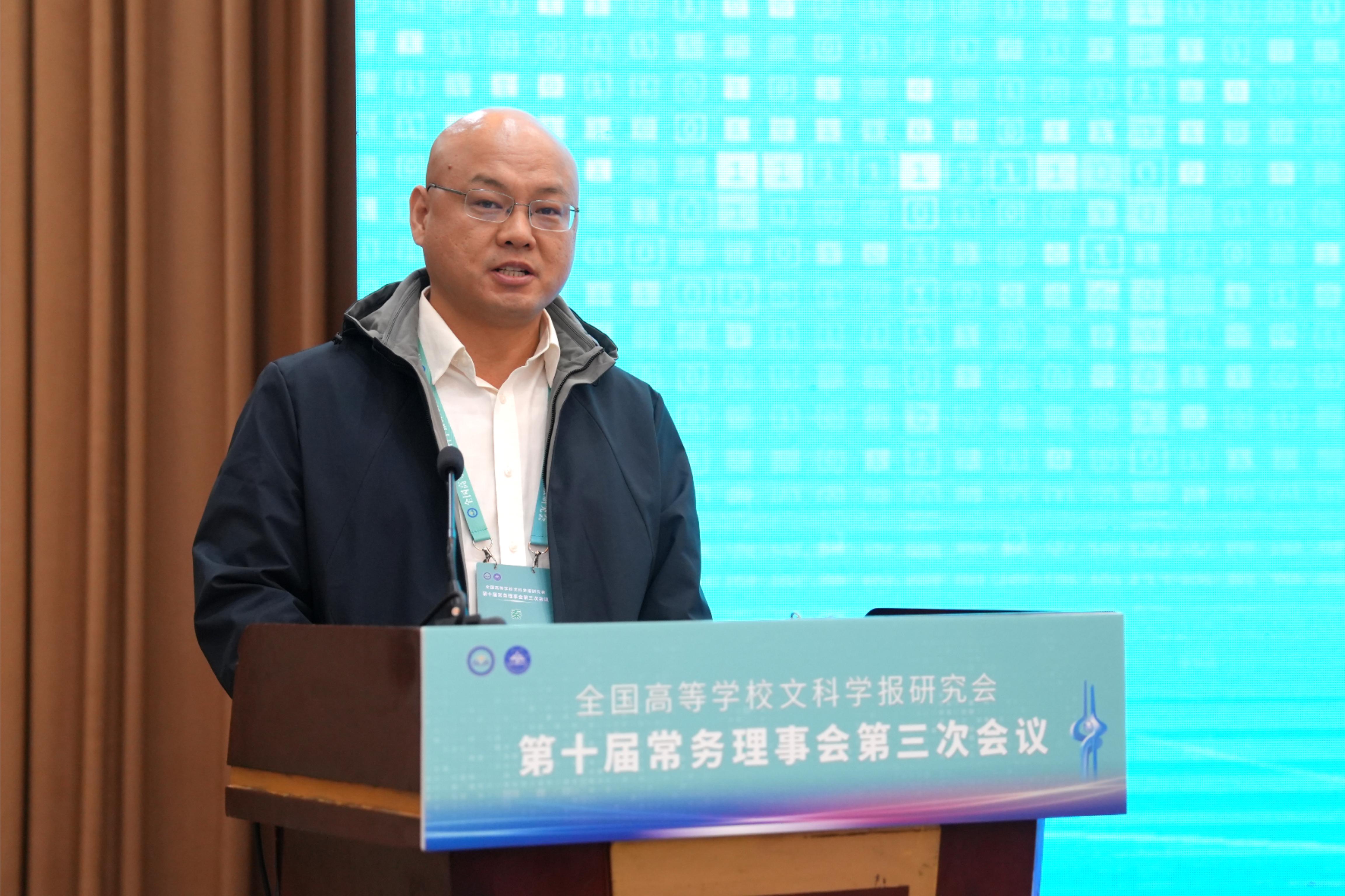 与《文史哲》编辑部对会议的支持,同时也对中宣部及山东省委宣传部领导的莅临表示感谢,指出主管部门的指导对研究会和期刊的发展具有重要帮助。他强调,研究会及各学报应紧密围绕习近平总书记“明体达用,体用贯通”的文化思想,在以下七个方面展开工作:第一,要打造期刊核心竞争力,建构中国特色的期刊体系;第二,要贯彻新的办刊理念,自觉服务于中国特色哲学社会科学、中国自主知识体系的建构;第三,要处理好理论与实践、学术与政治的关系,自觉服务国家发展战略;第四,要处理好学术与评价的关系,建构中国特色的期刊评价体系;第五,要积极应对数字时代人工智能的挑战,探索学术期刊未来的发展趋势;第六,要扶持人才成长,扶持培育青年才俊;第七,要架设各种文明互学互鉴的桥梁,积极推动中华文化走向世界。