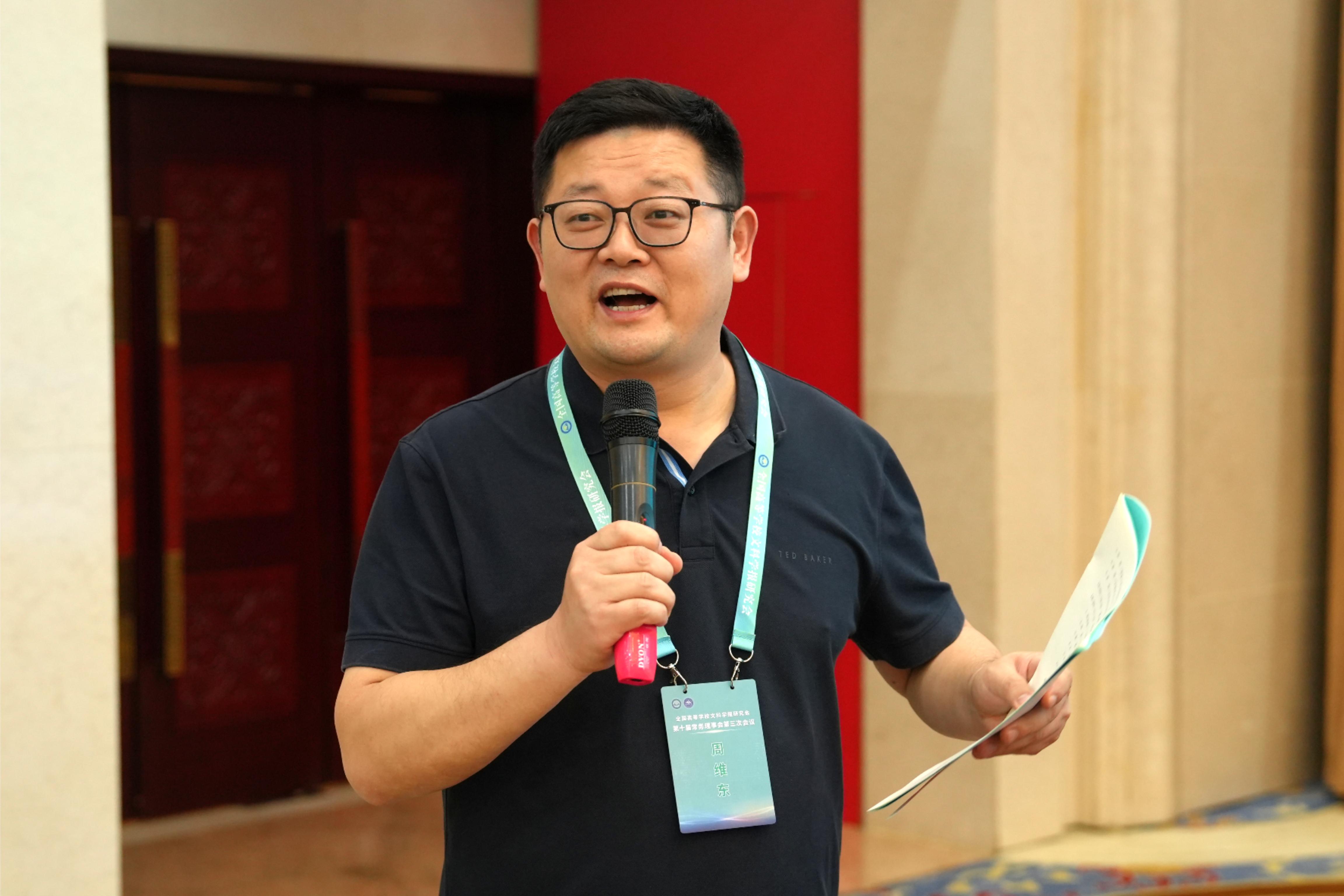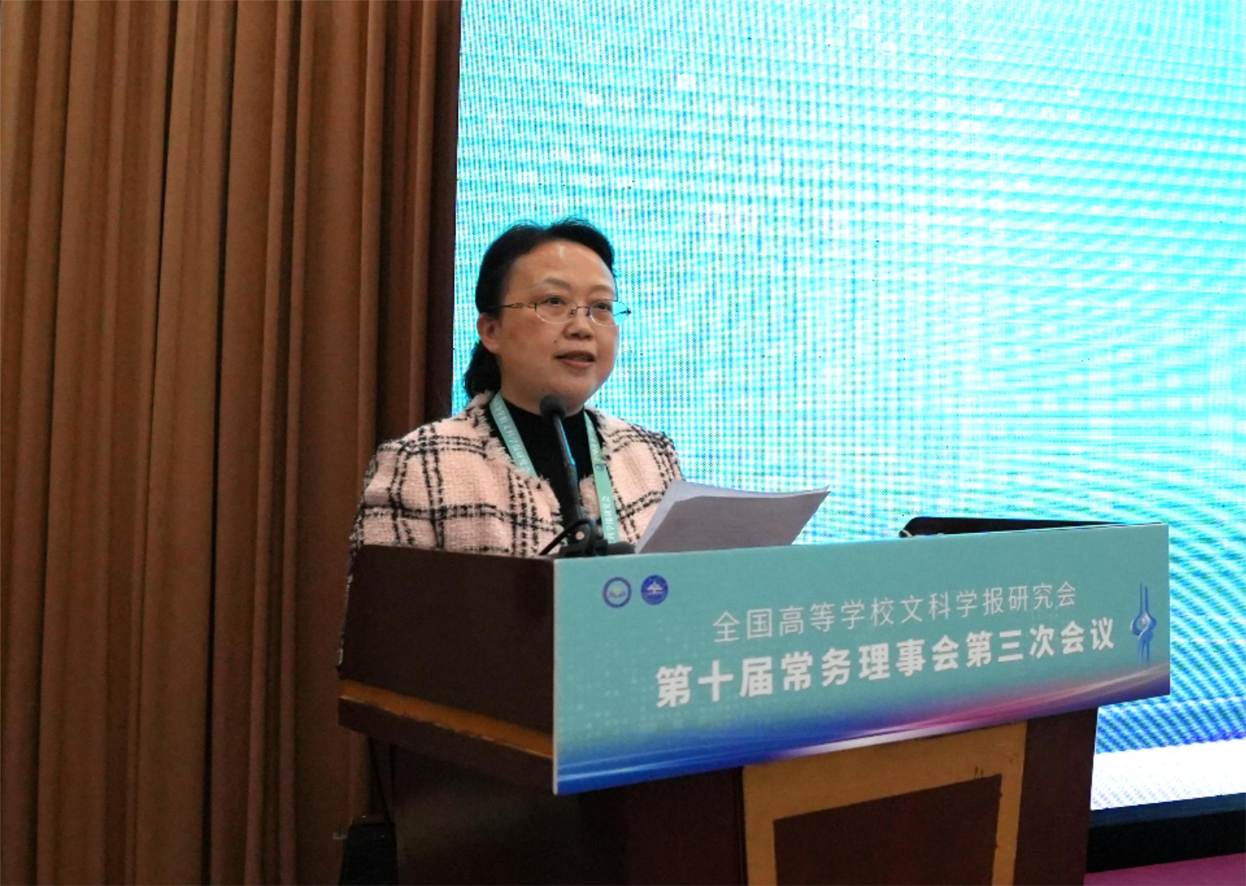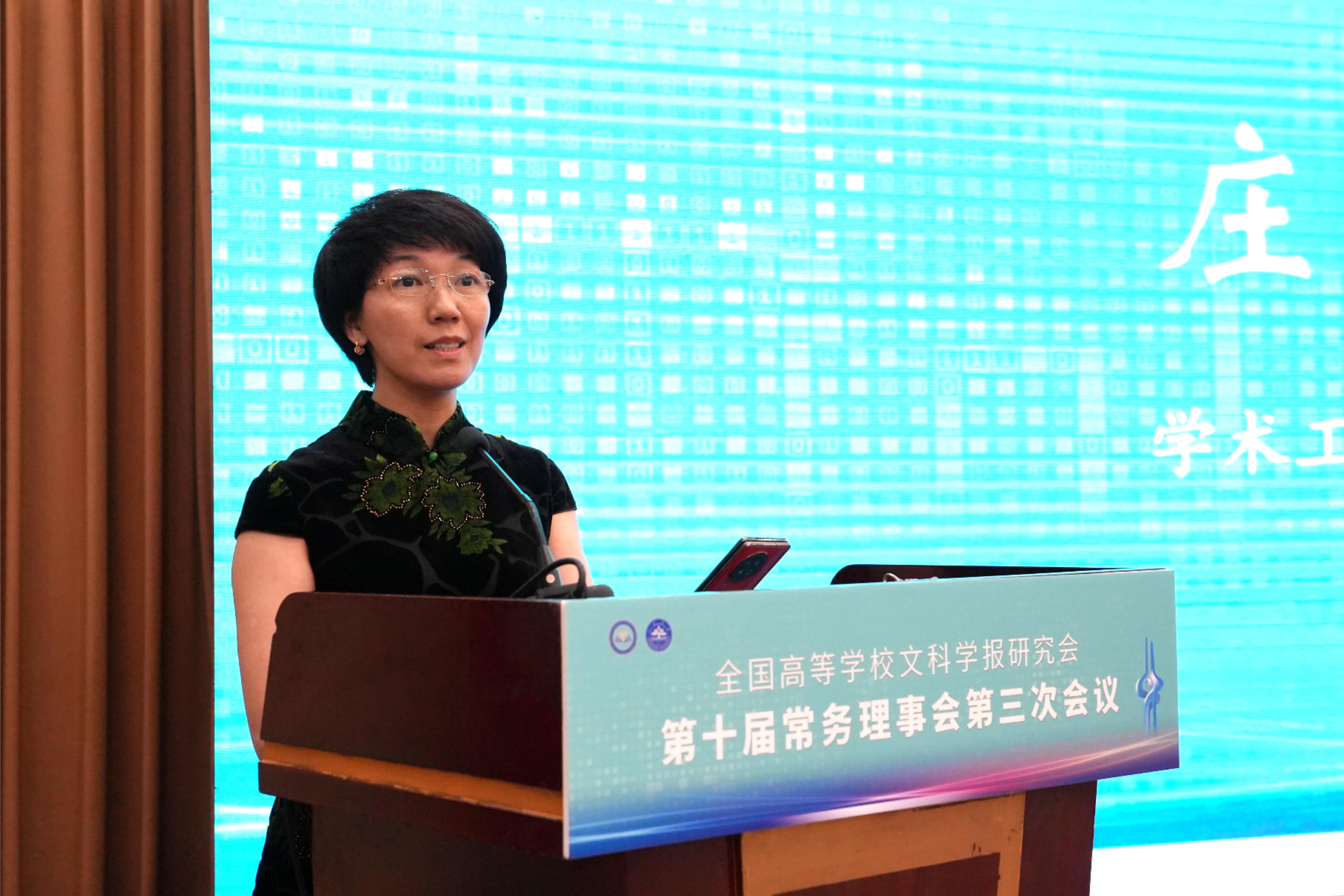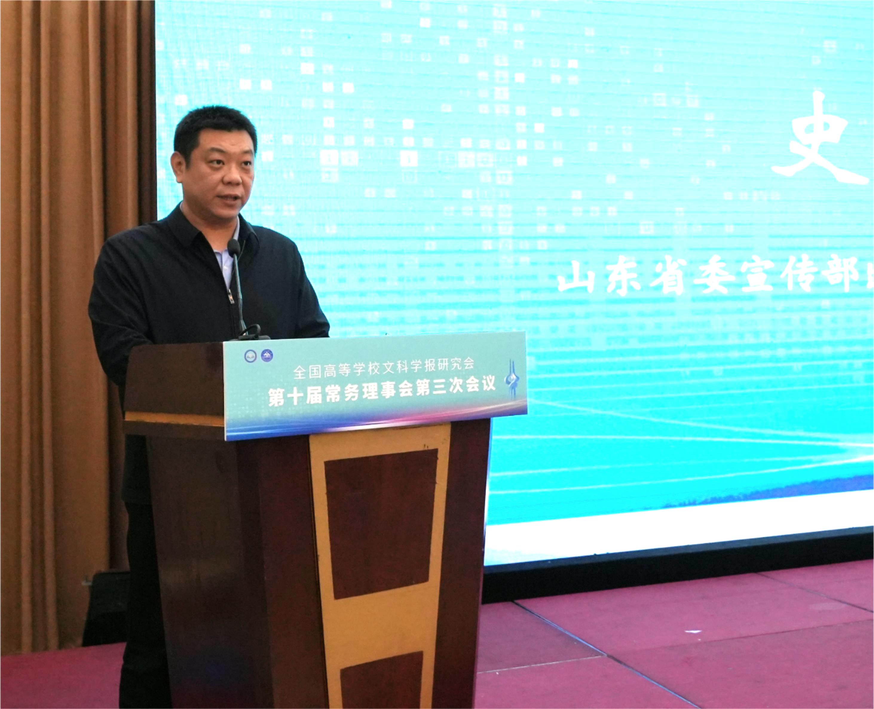 与《文史哲》编辑部对会议的支持,同时也对中宣部及山东省委宣传部领导的莅临表示感谢,指出主管部门的指导对研究会和期刊的发展具有重要帮助。他强调,研究会及各学报应紧密围绕习近平总书记“明体达用,体用贯通”的文化思想,在以下七个方面展开工作:第一,要打造期刊核心竞争力,建构中国特色的期刊体系;第二,要贯彻新的办刊理念,自觉服务于中国特色哲学社会科学、中国自主知识体系的建构;第三,要处理好理论与实践、学术与政治的关系,自觉服务国家发展战略;第四,要处理好学术与评价的关系,建构中国特色的期刊评价体系;第五,要积极应对数字时代人工智能的挑战,探索学术期刊未来的发展趋势;第六,要扶持人才成长,扶持培育青年才俊;第七,要架设各种文明互学互鉴的桥梁,积极推动中华文化走向世界。