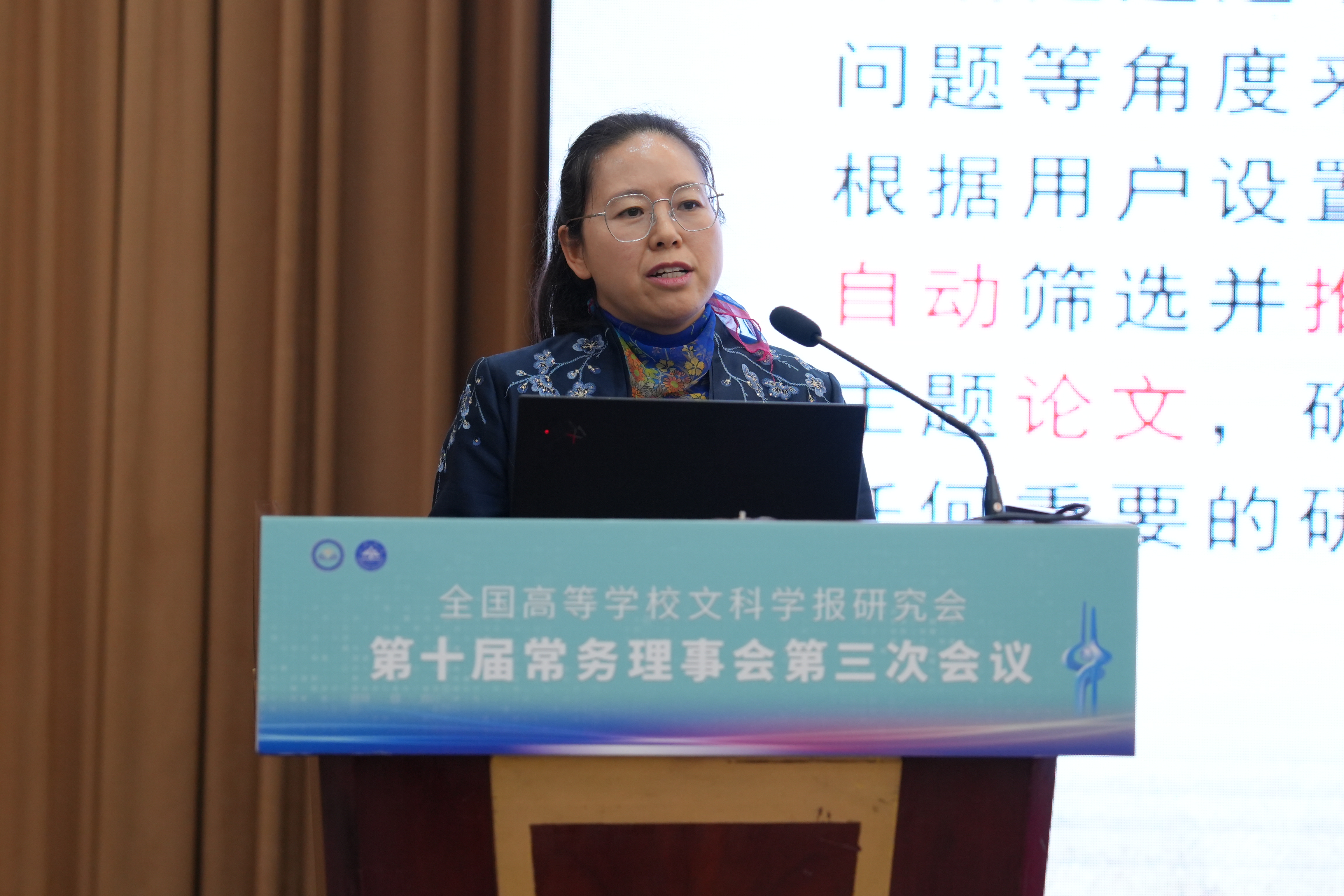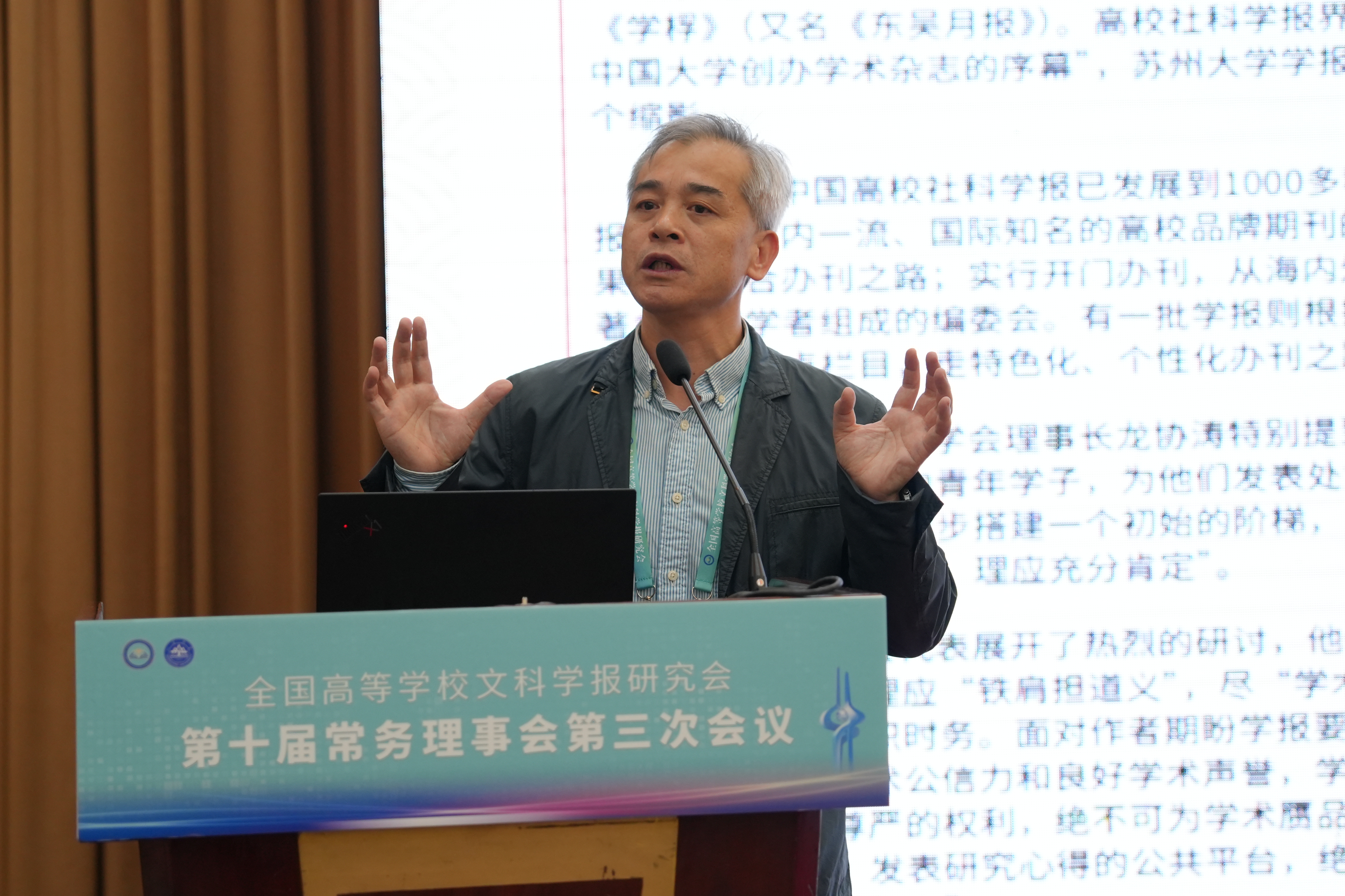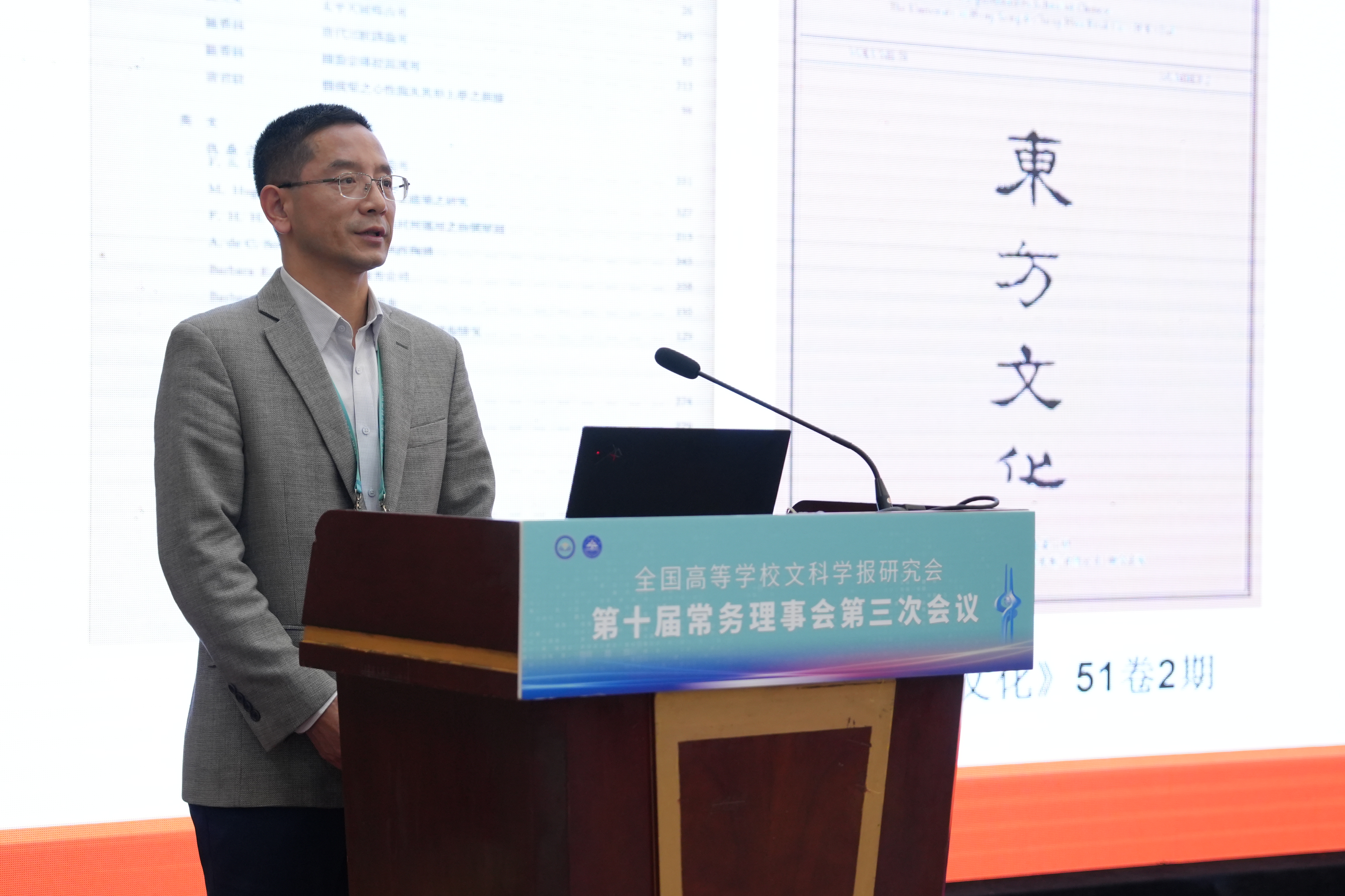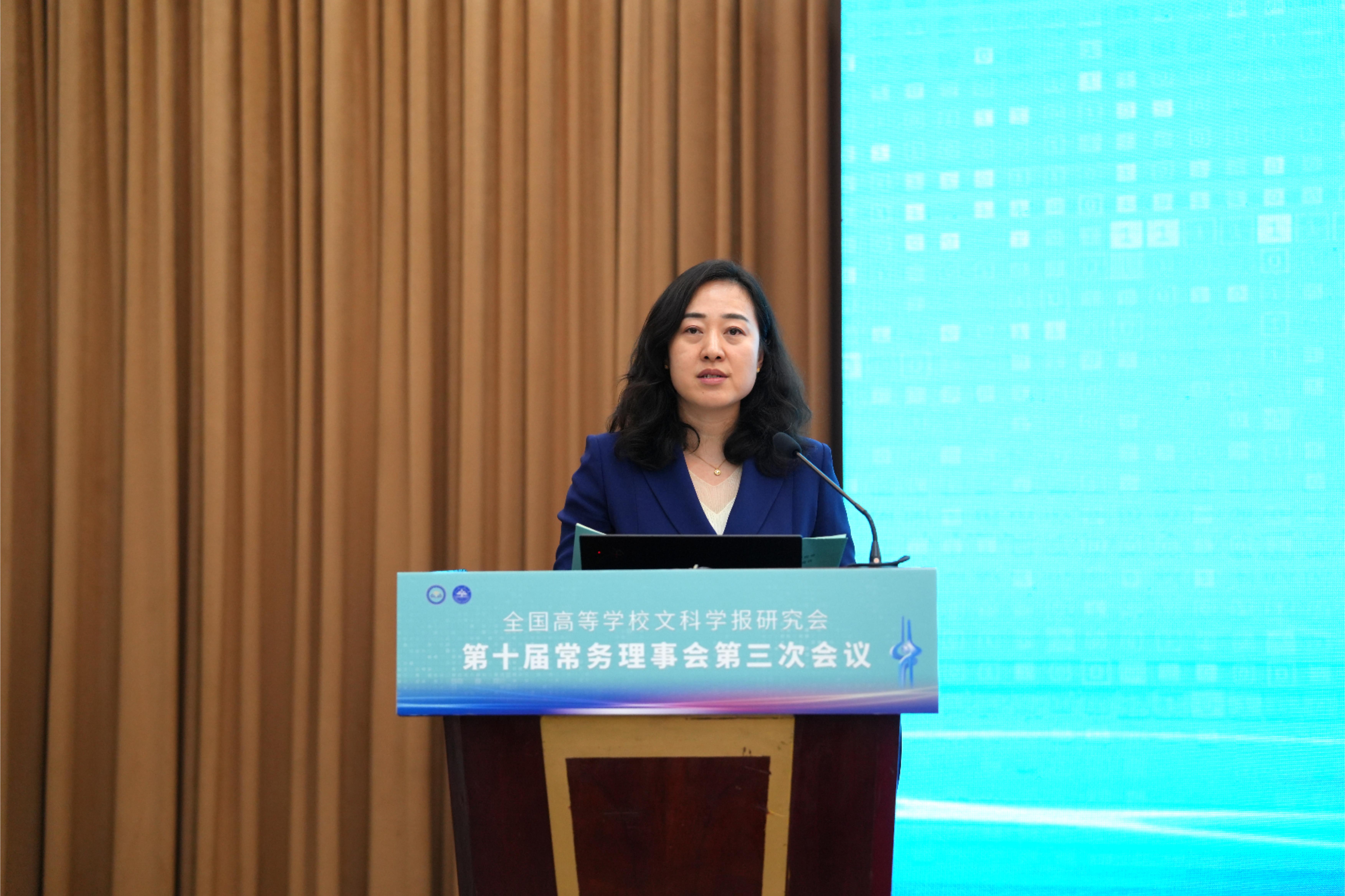 与《文史哲》编辑部对会议的支持,同时也对中宣部及山东省委宣传部领导的莅临表示感谢,指出主管部门的指导对研究会和期刊的发展具有重要帮助。他强调,研究会及各学报应紧密围绕习近平总书记“明体达用,体用贯通”的文化思想,在以下七个方面展开工作:第一,要打造期刊核心竞争力,建构中国特色的期刊体系;第二,要贯彻新的办刊理念,自觉服务于中国特色哲学社会科学、中国自主知识体系的建构;第三,要处理好理论与实践、学术与政治的关系,自觉服务国家发展战略;第四,要处理好学术与评价的关系,建构中国特色的期刊评价体系;第五,要积极应对数字时代人工智能的挑战,探索学术期刊未来的发展趋势;第六,要扶持人才成长,扶持培育青年才俊;第七,要架设各种文明互学互鉴的桥梁,积极推动中华文化走向世界。